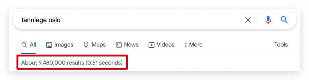 Om vi går tilbake til eksempelet med tannlege Oslo, ser vi at det er 1 600 som trykker på resultater under søket “tannlege Oslo”. Kun 11% av disse kommer fra betalte plattformer som Google ads.