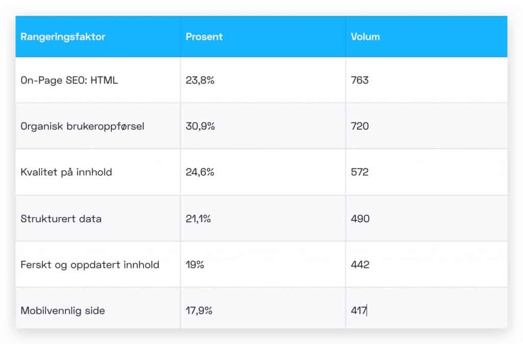 I denne artikkelen har vi listet opp noen av de viktigste rangeringsfaktorene Google ser etter - samt direkte kunnskap og veiledning du kan bruke når du arbeider med søkemotoroptimalisering. Om du ønsker å kommer i gang med din SEO for din bedrift i dag, kan du starte med en gratis SEO analyse hos oss.